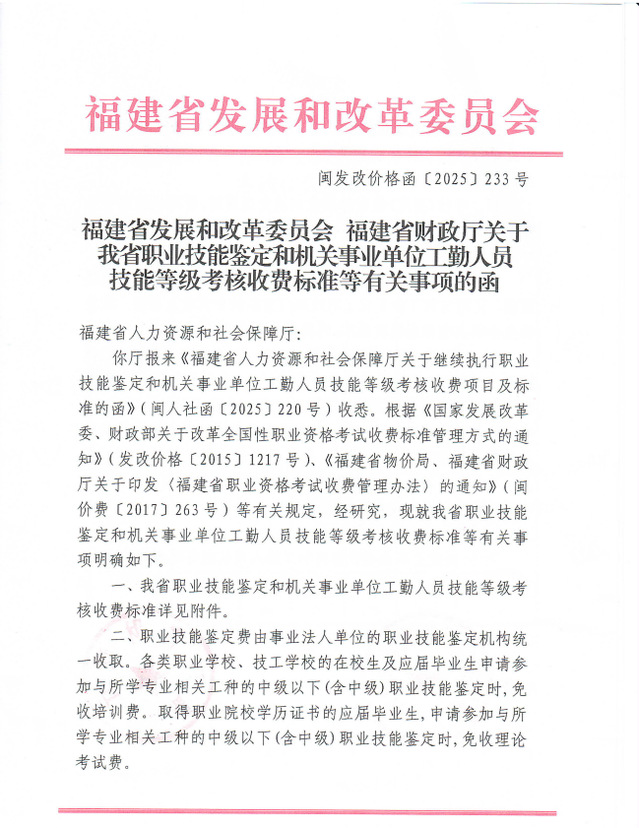 福建省发展和改革委员会 福建省财政厅关于我省职业技能鉴定和机关事业单位工勤人员技能等级考核收费标准等有关事项的函